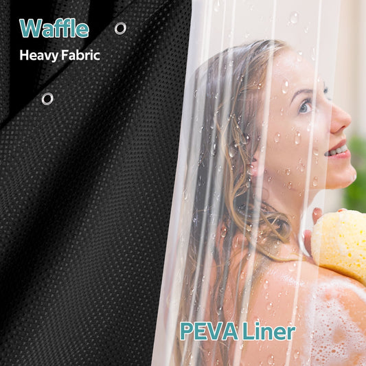 Cocosity Waffle Textured Heavy Duty Shower Curtains with PEVA Clear Shower Liner & Hooks - Black 84"x72"