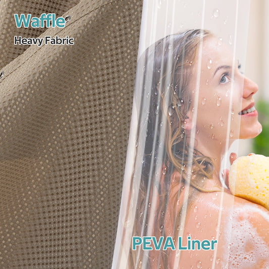Cocosity Waffle Textured Heavy Duty Shower Curtains with PEVA Clear Shower Liner & Hooks - Brown 84"x72"