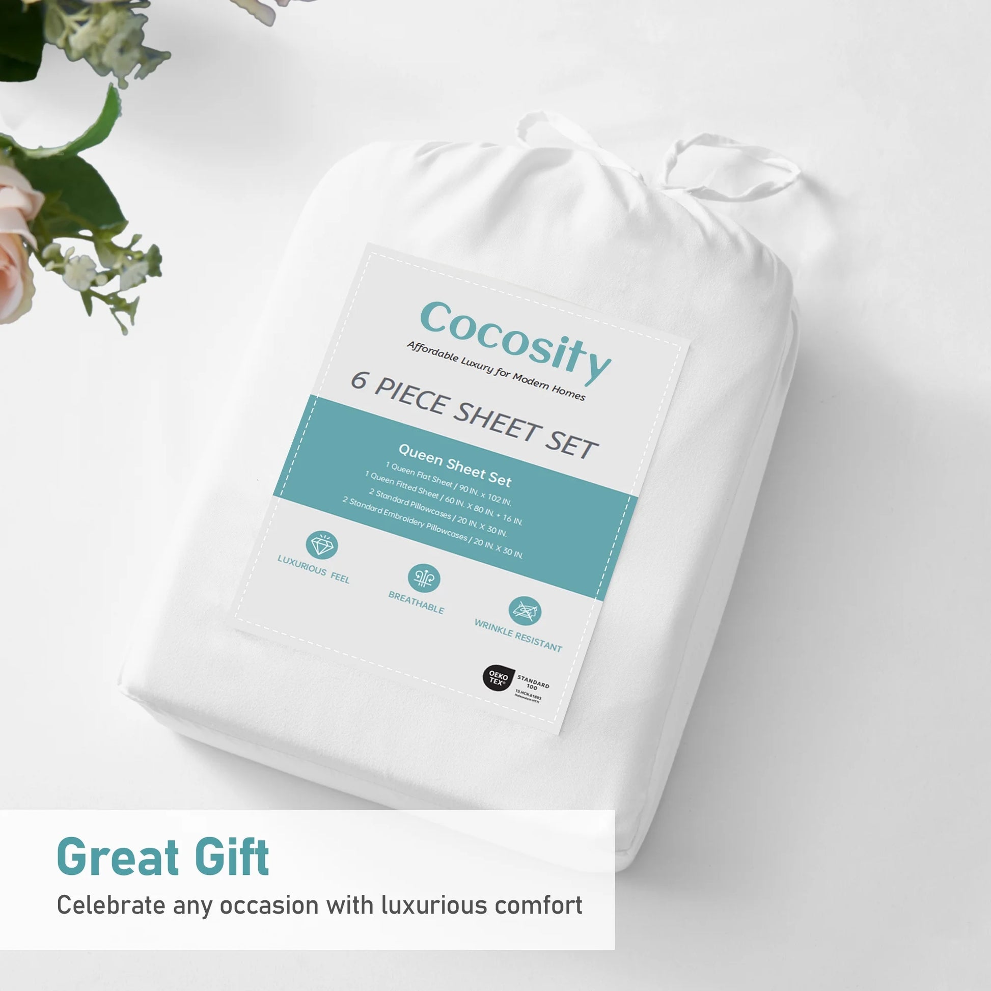 Six-piece bedding set includes a flat bed sheet, deep pocket fitted sheets, two embroidered pillowcases,and two pillowcases. High six-piece set is made of Premium quality, durable & fitnest polyester microfiber material that's made to last, soft to use, with strong, durable construction.offers a range of luxurious and homey bedding items that gives your bedroom a classy appearance. From bedding sets & pillows to mattress protectors and under bed risers, bedding sheet set with all-around elastic used in the fitted sheet makes it fit easily onto the mattress while giving a nice finish to the bed,Cocosity smooth feel of the bedding sheet is very cozy which keeps you cool during summers and warm during winters,is an ideal bed set for all season,microfiber material is processed to make our bedding set resistant to shrinkage and fading which adds to the longevity of the set by keeping it in great condition.